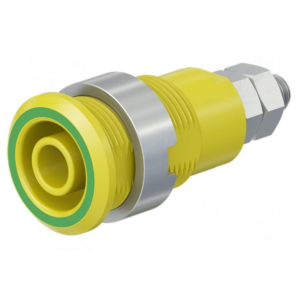 Gniazdo charakteryzuje się prądem znamionowym wynoszącym 32 A oraz całkowitą długością 33 mm. Obudowa złącza wykonana jest w kolorze żółto-zielonym. Produkt jest zgodny z normami bezpieczeństwa CAT III 1000 V, CAT IV 600 V oraz EN 61010.