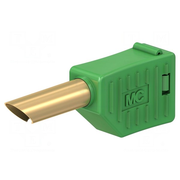 Złącze bananowe typu wtyk o średnicy 4 mm przeznaczone do zastosowań laboratoryjnych. Komponent pracuje przy prądzie znamionowym 19 A oraz napięciu znamionowym 30 V AC lub 60 V DC.