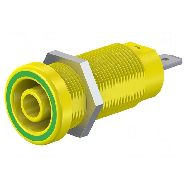 Złącze bananowe 4mm w formie gniazda jest przeznaczone do montażu na panelu za pomocą połączeń lutowanych. Element charakteryzuje się napięciem znamionowym 1kV oraz prądem znamionowym 24A. Styki zostały poddane procesowi niklowania, co wpływa na ich właściwości użytkowe. Produkt jest dostępny w wersji nieizolowanej w kolorze żółto-zielonym.