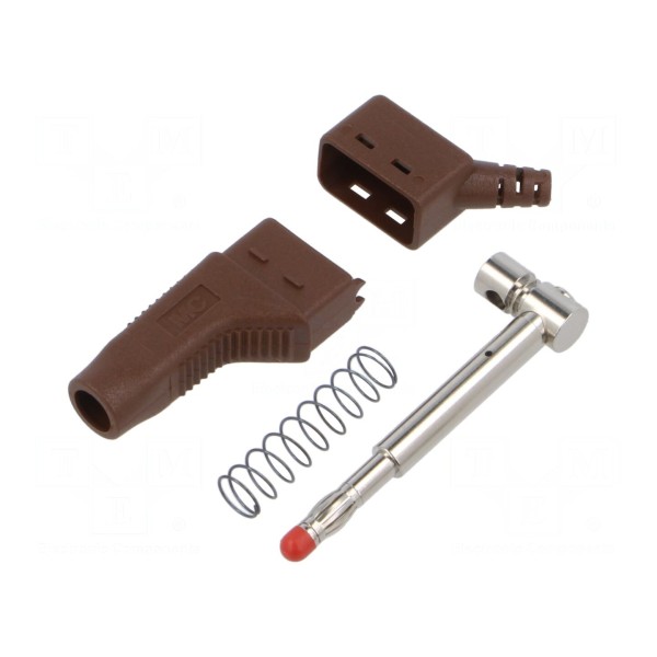 Konstrukcja elementu obejmuje izolację, zintegrowane gniazdo osiowe 4mm oraz ruchomą osłonę. Złącze przystosowane jest do montażu na przewód o przekroju do 1mm² za pomocą połączenia przykręcanego. Produkt występuje w kolorze brązowym.