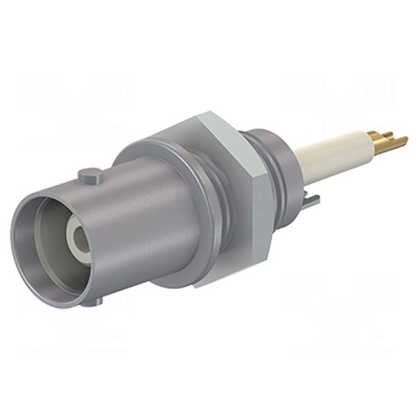 Złącze BNC typu gniazdo zostało zaprojektowane do montażu panelowego metodą lutowania. Element charakteryzuje się izolowaną wersją konstrukcyjną oraz szarym kolorem obudowy.