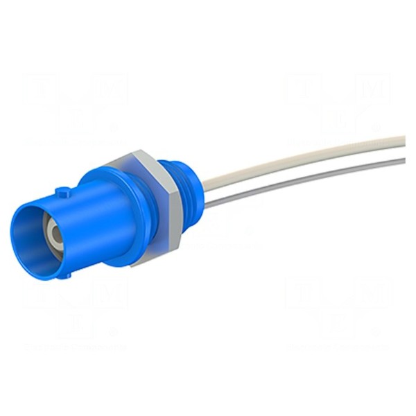 Konstrukcja produktu jest dostosowana do pracy w zakresie temperatur od 5°C do 40°C. Komponent spełnia wymagania norm bezpieczeństwa CAT II 600V, CAT II 1000V, CAT III 300V oraz CAT III 600V. Obudowa złącza wykonana jest w kolorze niebieskim.