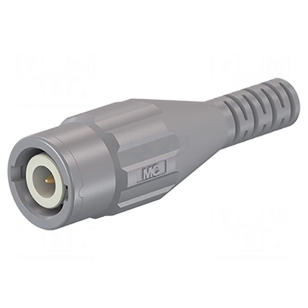 Złącze BNC w wersji żeńskiej stanowi izolowane gniazdo przeznaczone do montażu zaciskanego. Element został wykonany z mosiądzu z niklowanym pokryciem styków, co wpływa na parametry połączenia w warunkach laboratoryjnych. Obudowa złącza utrzymana jest w kolorze szarym.