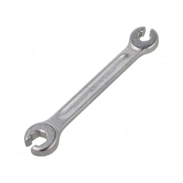 Klucz oczkowy półotwarty dwustronny wykonany ze stali chromowej przeznaczony jest do prac montażowych. Narzędzie charakteryzuje się cienkościenną budową, co ułatwia dostęp w ograniczonej przestrzeni. Główki oczkowe zostały odgięte pod kątem 10° względem trzonu klucza.