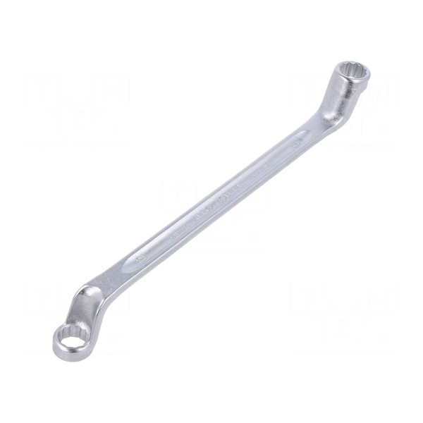 Klucz oczkowy dwustronny wykonany ze stali chromowanej. Narzędzie posiada odgiętą konstrukcję oraz jest odsadzone, co umożliwia pracę w miejscach z utrudnionym dostępem.