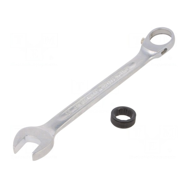 Klucz płasko-oczkowy wyposażony w zintegrowany mechanizm grzechotkowy. Narzędzie przeznaczone jest do obsługi śrub i nakrętek o rozmiarze 14mm.