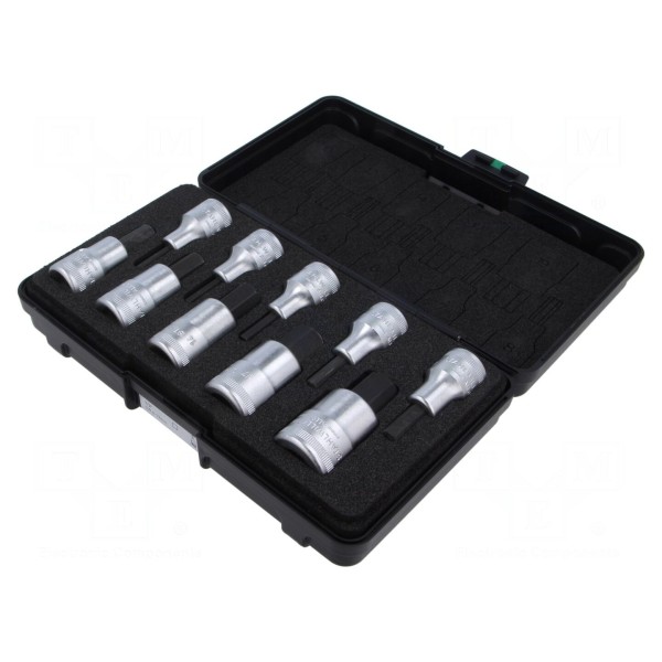 Zestaw kluczy STAHLWILLE 96031508 zawiera 10 elementów przystosowanych do współpracy z uchwytami o rozmiarze 1/2". Komplet narzędzi został zaprojektowany do prac wymagających użycia standardowych gniazd montażowych.