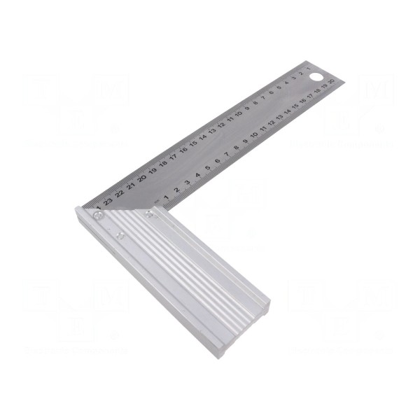 Kątownik wyposażony jest w wbudowaną skalę z podziałką, która została umiejscowiona wzdłuż dłuższego boku narzędzia. Konstrukcja pozwala na dokonywanie pomiarów oraz wyznaczanie kątów w pracach warsztatowych.
