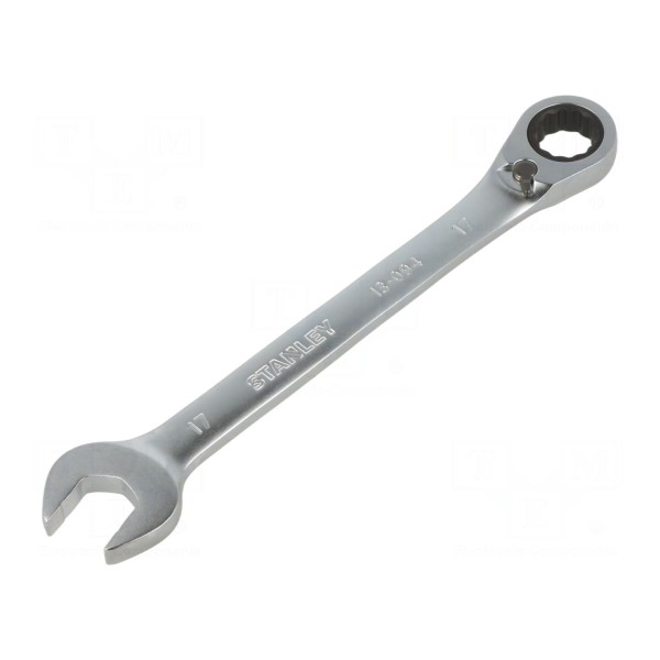 Klucz płasko-oczkowy wyposażony w mechanizm grzechotkowy o rozmiarze 17 mm. Wykonany ze stali chromowo-wanadowej, co zapewnia wytrzymałość konstrukcji podczas pracy z elementami złącznymi.