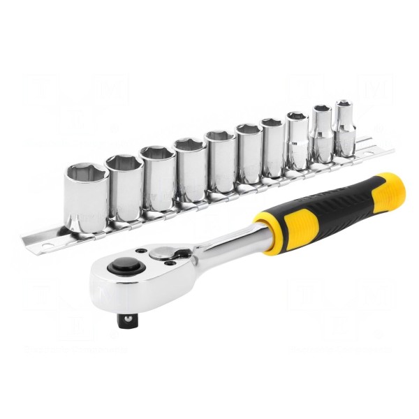 Zestaw kluczy nasadowych 1/4" przeznaczony jest do prac montażowych i serwisowych. Komplet składa się z 11 elementów typu sześciokątnego, które zapewniają dopasowanie do standardowych połączeń śrubowych.