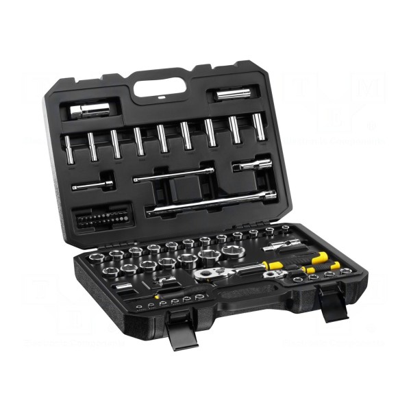 Zestaw narzędzi nasadowych marki STANLEY składa się z 75 elementów. Komplet obejmuje akcesoria przystosowane do pracy z gniazdami uchwytu o rozmiarach 1/2" oraz 1/4".