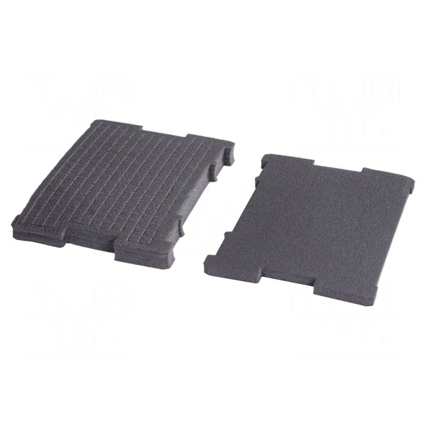 Wkładka piankowa o wymiarach 430x308x62mm przeznaczona jest do organizacji przestrzeni wewnątrz pojemników narzędziowych. Element został wykonany w kolorze szarym, co ułatwia utrzymanie porządku w przechowywanym wyposażeniu.