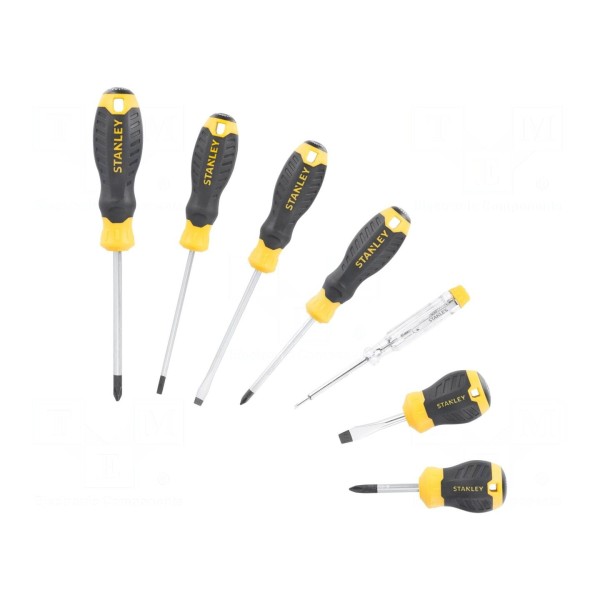 Zestaw wkrętaków uniwersalnych STANLEY zawiera 7 elementów, obejmujących najczęściej stosowane profile grota typu Phillips oraz płaskiego. Komplet przeznaczony jest do różnorodnych prac montażowych i serwisowych wymagających obsługi różnych typów śrub.