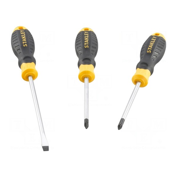 Zestaw zawiera trzy wkrętaki o uniwersalnym zastosowaniu. W skład kompletu wchodzą narzędzia wyposażone w groty typu Phillips, płaskie oraz Pozidriv, co pozwala na obsługę zróżnicowanych typów wkrętów.
