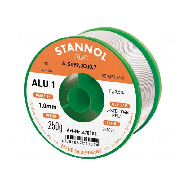 Spoiwo lutownicze w formie drutu o średnicy 1 mm przeznaczone do procesów lutowania miękkiego. Produkt oparty jest na stopie bezołowiowym Sn99,3Cu0,7, znanym jako TC.