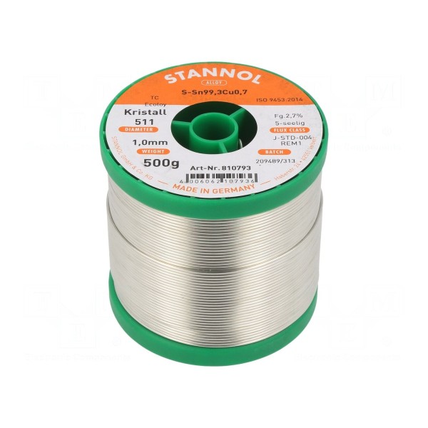 Bezołowiowy drut lutowniczy STANNOL o składzie stopu Sn99,3Cu0,7 przeznaczony jest do lutowania miękkiego. Spoiwo cechuje się temperaturą topnienia wynoszącą 227°C i jest dostarczane na szpuli o masie 0,5 kg.