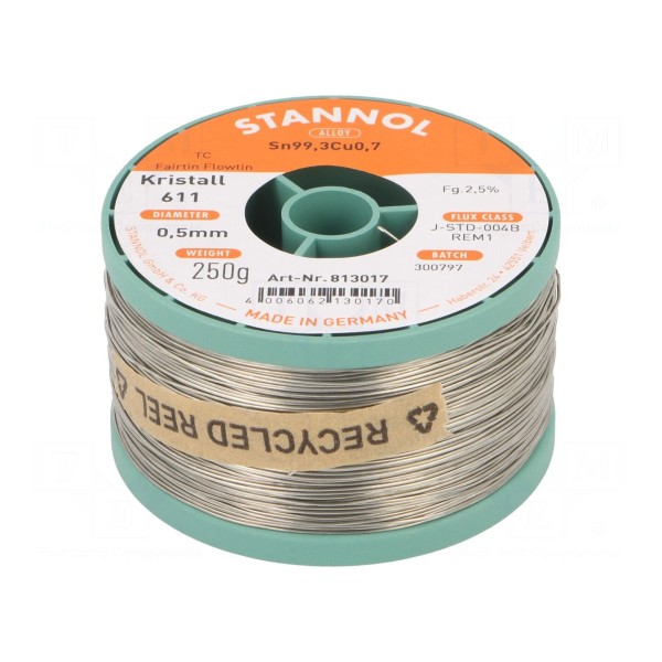 Bezołowiowy drut lutowniczy STANNOL o składzie stopu Sn99,3Cu0,7 jest przeznaczony do procesów lutowania miękkiego. Średnica spoiwa wynosi 0,5 mm, a masa całkowita szpuli to 0,25 kg.