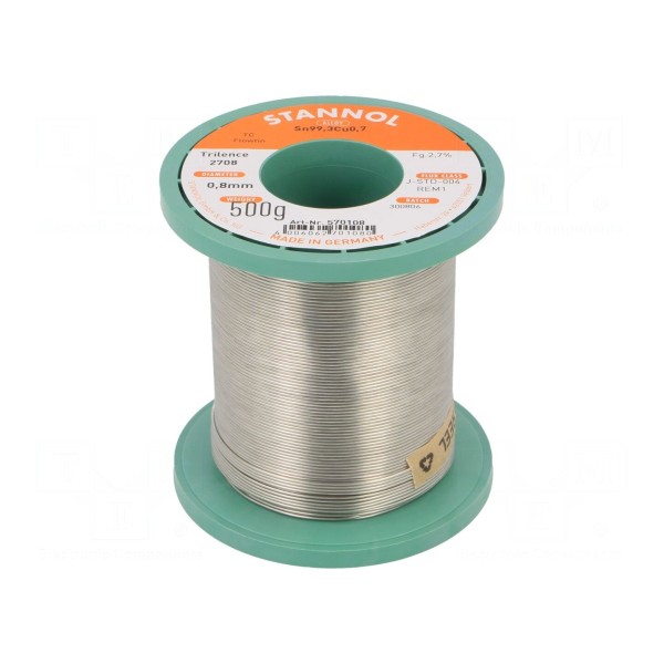 Drut lutowniczy bezołowiowy o składzie stopu Sn99,3Cu0,7, przeznaczony do procesów lutowania miękkiego. Średnica drutu wynosi 0,8 mm, co zapewnia precyzyjne nanoszenie spoiwa podczas prac montażowych. Produkt dostarczany jest na szpuli o masie 500 g.