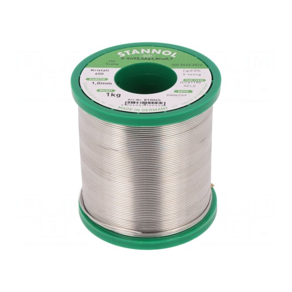 Bezołowiowy drut lutowniczy TSC o składzie stopu Sn95,5Ag3,8Cu0,7 przeznaczony jest do lutowania miękkiego. Średnica przewodu wynosi 1 mm, a masa spoiwa nawiniętego na szpulę to 1 kg. Temperatura topnienia dla tego stopu wynosi 217°C.