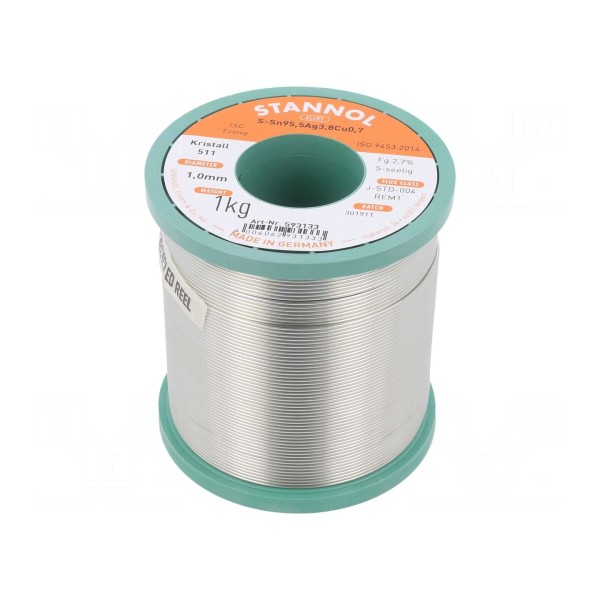 Drut lutowniczy bezołowiowy z serii Kristall 511 o składzie stopu Sn95,5Ag3,8Cu0,7. Spoiwo przeznaczone do lutowania miękkiego charakteryzuje się temperaturą topnienia wynoszącą 217°C oraz średnicą 1 mm.