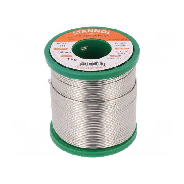 Bezołowiowy drut lutowniczy wykonany ze stopu TSC o składzie Sn95,5Ag3,8Cu0,7. Spoiwo o średnicy 1,5 mm przeznaczone jest do lutowania miękkiego i dostarczane na szpuli o masie 1 kg. Temperatura topnienia użytego stopu wynosi 217°C.
