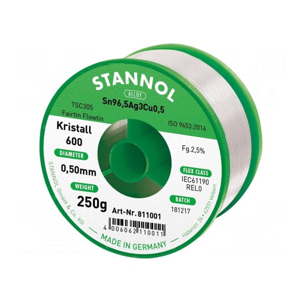 Bezołowiowy drut lutowniczy o składzie stopu Sn96,5Ag3Cu0,5 (TSC305) przeznaczony jest do lutowania miękkiego. Średnica przewodu wynosi 0,5 mm, a całość została nawinięta na szpulę o masie 250 g.