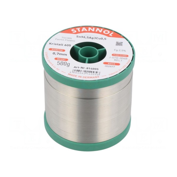 Bezołowiowy drut lutowniczy o składzie stopu Sn96,5Ag3Cu0,5, znany również jako TSC305, jest przeznaczony do procesów lutowania miękkiego. Średnica przewodu wynosi 0,7 mm, co umożliwia precyzyjne nanoszenie spoiwa w różnych aplikacjach elektronicznych.