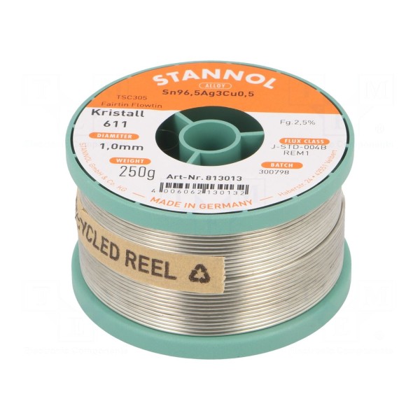 Spoiwo lutownicze w formie drutu o średnicy 1 mm przeznaczone jest do lutowania miękkiego. Produkt stanowi stop bezołowiowy o składzie Sn96,5Ag3Cu0,5, znany jako TSC305. Masa spoiwa na szpuli wynosi 0,25 kg.