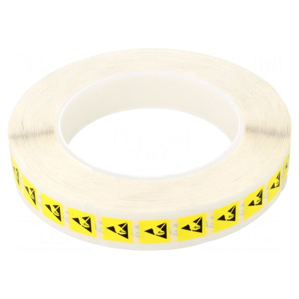 Etykieta samoprzylepna w wersji ESD przeznaczona jest do oznaczania komponentów i urządzeń wymagających ochrony przed wyładowaniami elektrostatycznymi. Produkt posiada wymiary 12x12 mm i występuje w kolorystyce czarno-żółtej.