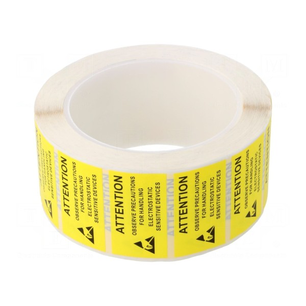 Etykieta samoprzylepna o wymiarach 25x45mm przeznaczona do oznaczania elementów i stref wymagających ochrony przed wyładowaniami elektrostatycznymi (ESD). Produkt wykonany jest w kolorystyce czarno-żółtej, co zapewnia dobrą widoczność ostrzeżenia.