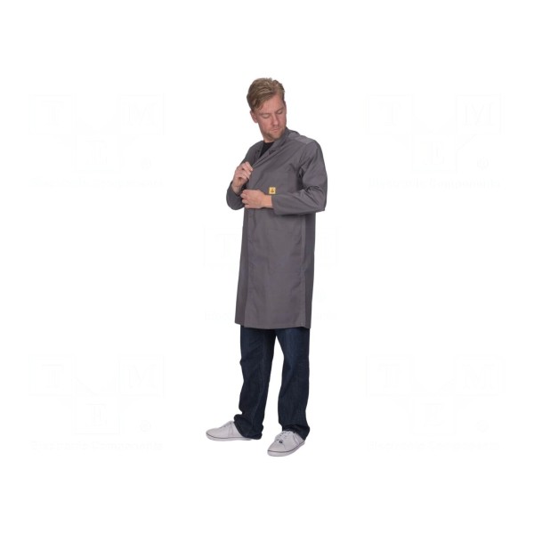 Fartuch antystatyczny typu unisex wykonany z mieszanki bawełny, poliestru oraz włókien przewodzących. Odzież charakteryzuje się gramaturą 135g/m² i jest utrzymana w szarej kolorystyce. Model zaprojektowano w kroju o długości 3/4, co zapewnia odpowiednią osłonę podczas wykonywania prac technicznych.
