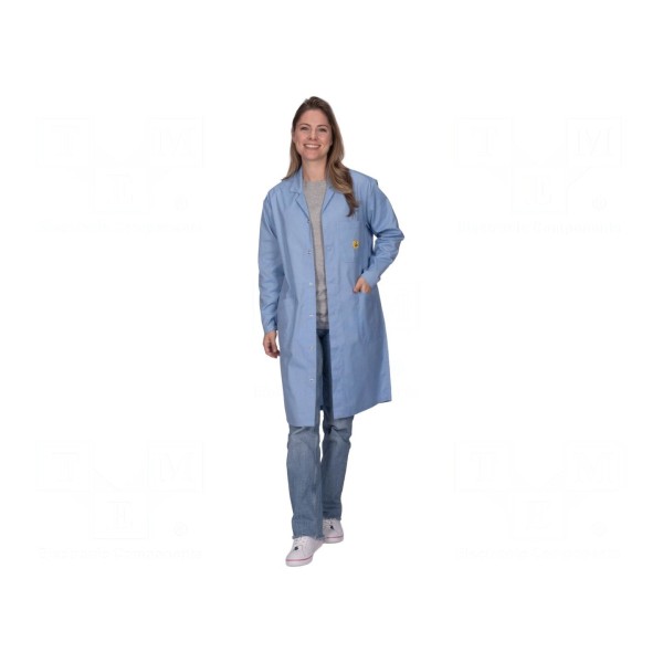 Fartuch antystatyczny w rozmiarze XS wykonany jest z mieszanki bawełny, poliestru oraz włókien przewodzących. Odzież typu unisex o kroju 3/4 charakteryzuje się jasnoniebieskim kolorem i gramaturą materiału wynoszącą 135g/m².