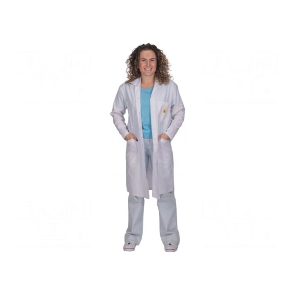 Konstrukcja w kolorze białym w rozmiarze XS wyposażona jest w trzy kieszenie. Produkt jest zgodny z normami ANSI ESD S20:20 oraz IEC 61340-5-1, co potwierdza jego właściwości ochronne. Fartuch może być poddawany praniu w temperaturze do 60°C.
