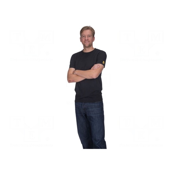 Koszulka T-shirt w kolorze czarnym została wykonana z mieszanki bawełny oraz włókien przewodzących. Odzież typu unisex posiada właściwości rozpraszające ładunki elektrostatyczne, co potwierdza zgodność z normami ANSI ESD S20:20 oraz IEC 61340-5-1.