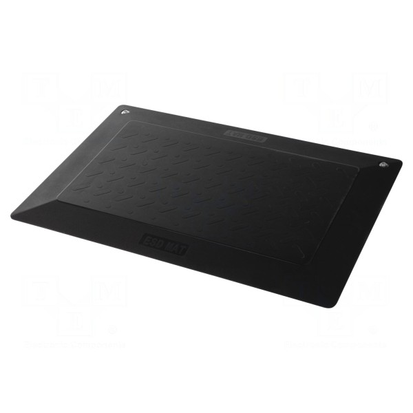 Konstrukcja maty o grubości 17 mm zapewnia komfort użytkowania w miejscach pracy stojącej. Powierzchnia o wymiarach 900 mm na 600 mm jest wykończona w kolorze czarnym. Mata wyposażona jest w dwa zatrzaski męskie o średnicy 10 mm, umożliwiające podłączenie przewodu uziemiającego.