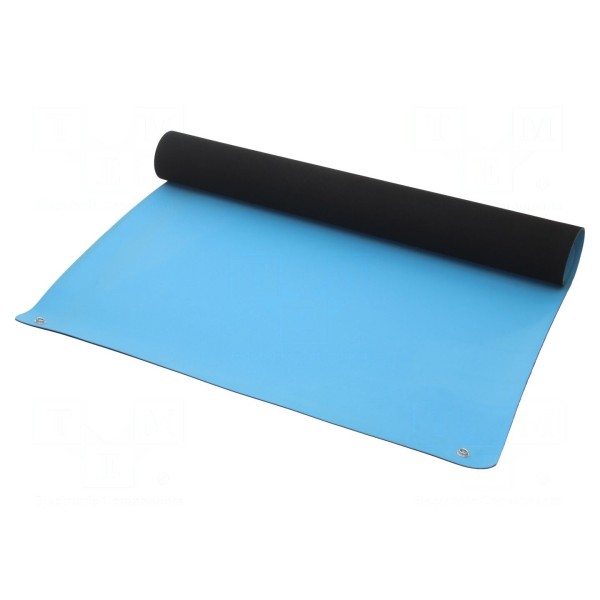 Mata stołowa ESD o wymiarach 0,9m na 0,6m została zaprojektowana do ochrony komponentów elektronicznych przed wyładowaniami elektrostatycznymi. Produkt charakteryzuje się grubością 2mm i jasnoniebieskim kolorem.