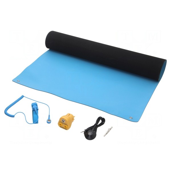 Zestaw stołowy ESD przeznaczony jest do ochrony komponentów elektronicznych przed wyładowaniami elektrostatycznymi w środowisku pracy. Mata o wymiarach 1,2m długości oraz 0,6m szerokości wykonana została z dwóch warstw specjalnej gumy o właściwościach rozpraszających i przewodzących. Całość konstrukcji posiada grubość 2mm i wykończona jest w kolorze jasnoniebieskim.