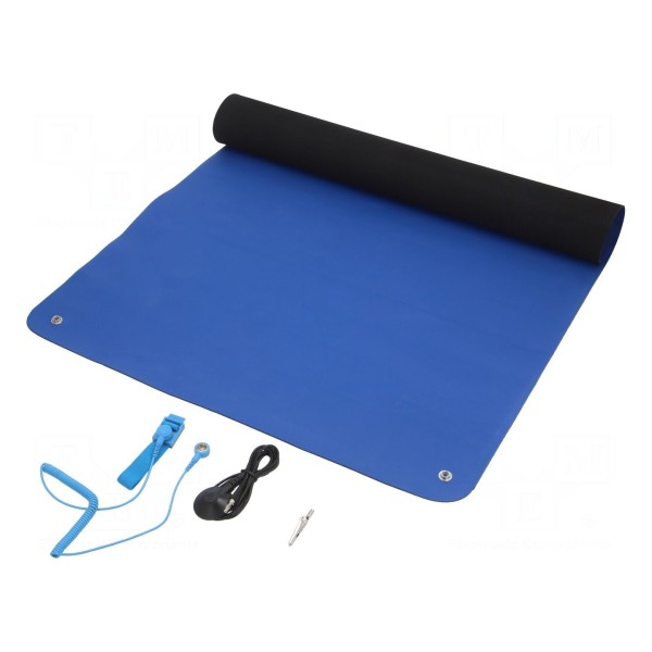 W zestawie: mata antystatyczna, opaska ESD na rękę, przewód do opaski, przewód uziemiający. Produkt przeznaczony jest do ochrony miejsc pracy przed wyładowaniami elektrostatycznymi poprzez bezpieczne odprowadzanie ładunków.