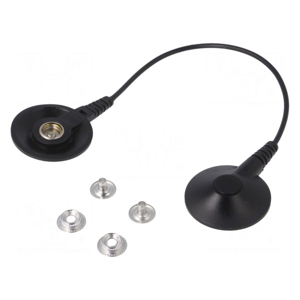 Produkt wyposażony jest w dwa zatrzaski żeńskie o średnicy 10 mm. Element wykonany jest w czarnym kolorze i dedykowany do podłączania mat ESD do punktu uziemienia.