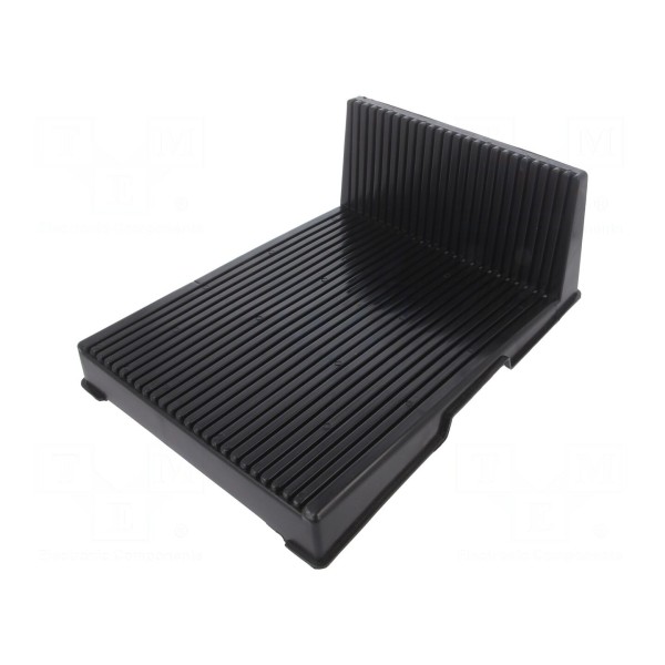 Stojak na płytki o konstrukcji ESD przeznaczony jest do bezpiecznego przechowywania podzespołów elektronicznych. Produkt wykonany został z tworzywa elektroprzewodzącego w kolorze czarnym.