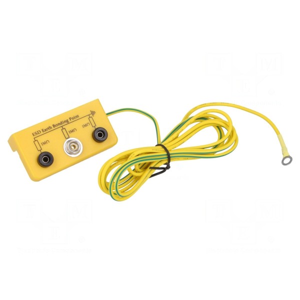Element wyposażony jest w złącze typu banan 4mm (gniazdo x2) oraz zatrzask męski 10mm. Konstrukcja pozwala na podłączenie mat ESD oraz opasek antystatycznych do punktu uziemienia.