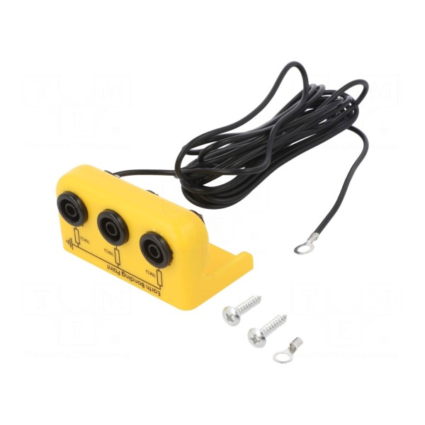 Konstrukcja elementu obejmuje trzy gniazda bananowe 4mm. Produkt znajduje zastosowanie w instalacjach zapewniających podłączenie mat ESD oraz opasek ESD do punktu uziemienia.