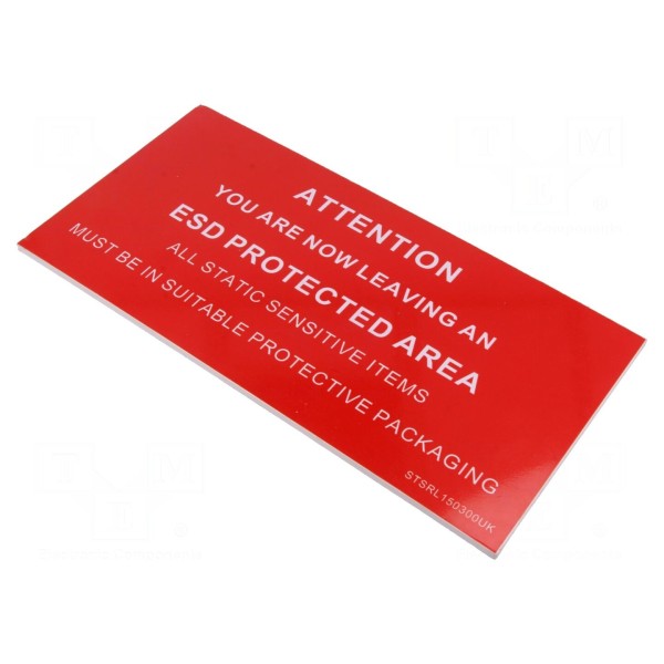 Tablica informacyjna przeznaczona jest do oznaczania stref chronionych przed wyładowaniami elektrostatycznymi (ESD). Produkt charakteryzuje się wymiarami 150x300 mm.