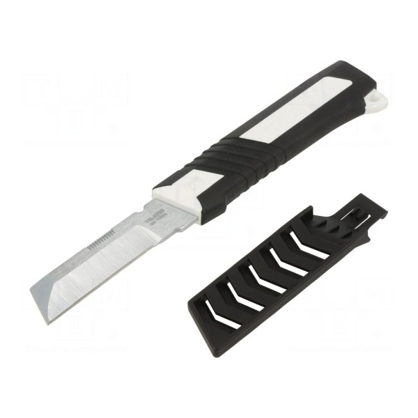 Narzędzie typu nóż o całkowitej długości 230 mm służy do prac przy kablach. Konstrukcja produktu obejmuje funkcję dłuta do drewna, co umożliwia wykonywanie dodatkowych prac obróbczych.