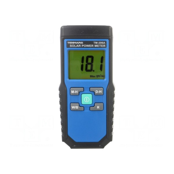 Luksomierz TENMARS TM-206 przeznaczony jest do pomiaru mocy promieniowania słonecznego. Urządzenie oferuje zakres pomiarowy do 1999W/m², obsługując jednostki W/m² oraz BTU/(ft²*h). Wyniki prezentowane są na wyświetlaczu LCD o rozdzielczości 2000 punktów.