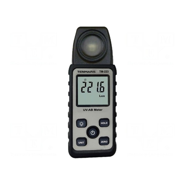 Luksomierz TENMARS TM-223 to przyrząd przeznaczony do pomiaru natężenia oświetlenia oraz mocy promieniowania słonecznego. Urządzenie obsługuje szeroki zakres źródeł światła, w tym oświetlenie fluorescencyjne, lampy metahalogenkowe oraz promieniowanie UV w zakresie 290–390 nm, obejmującym pasma UVA i UVB. Zakres pomiarowy miernika mieści się w przedziale od 4000 µW/cm² do 40 mW/cm².