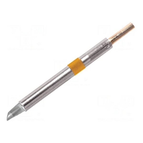 Grot z wbudowaną grzałką o kształcie ściętego stożka przeznaczony jest do wykorzystania w lutownicach oraz stacjach lutowniczych. Element charakteryzuje się wymiarem końcówki wynoszącym 3 mm oraz ścięciem pod kątem 45 stopni.