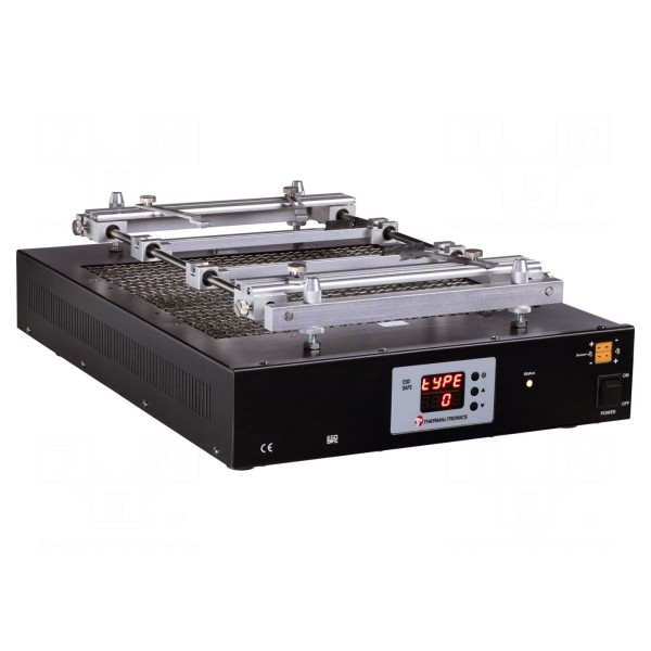 Podgrzewacz 1,5kW, powierzchnia 310x310mm, zakres 50–400°CPodgrzewacz Thermaltronics PH600 to urządzenie o mocy 1,5 kW zasilane napięciem 220–240 V AC, przeznaczone do podgrzewania płytek drukowanych przed montażem i demontażem komponentów. Sprzęt wykorzystuje grzałki kwarcowe oraz sterowanie mikroprocesorowe z cyfrową regulacją temperatury w zakresie od 50 do 400°C. Użytkownik ma do wyboru trzy tryby grzania, a o pracy urządzenia informuje wskaźnik LED oraz wyświetlacz typu LED. Urządzenie charakteryzuje się wykonaniem w wersji ESD i posiada powierzchnię roboczą o wymiarach 310x310 mm. Konstrukcja obejmuje statyw z regulacją w osiach XYZ oraz dwa gniazda umożliwiające podłączenie termopar. Całość mieści się w obudowie o wymiarach 520x380x100 mm i jest dostosowana do standardów zasilania w Europie. Zestaw znajduje zastosowanie przy regeneracji układów BGA oraz usuwaniu lutowia. W zestawie: zestaw dwóch termopar PH-KTC-1.