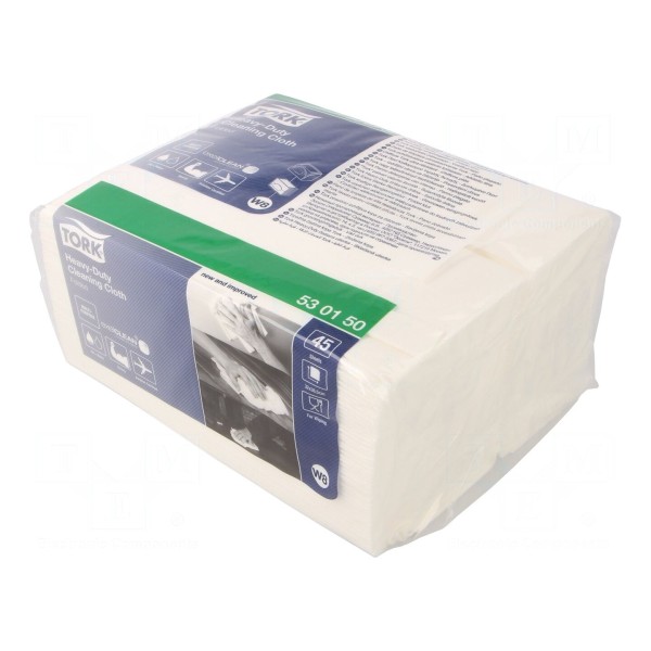 Czyściwo włókninowe TORK 530150 wykonane jest z mieszanki poliestru oraz polipropylenu. Produkt w kolorze białym dostarczany jest w formie suchej, zapakowany w foliowe opakowanie zbiorcze zawierające 45 sztuk arkuszy o wymiarach 320x385 mm.