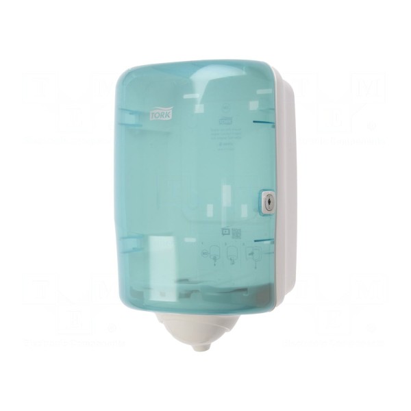 Dozownik przeznaczony do ręczników papierowych z systemem centralnego dozowania. Urządzenie zostało wykonane z plastiku w wersji mini, a jego kolorystyka utrzymana jest w tonacji turkusowo-białej. Wymiary zewnętrzne produktu wynoszą 321x191x180 mm.